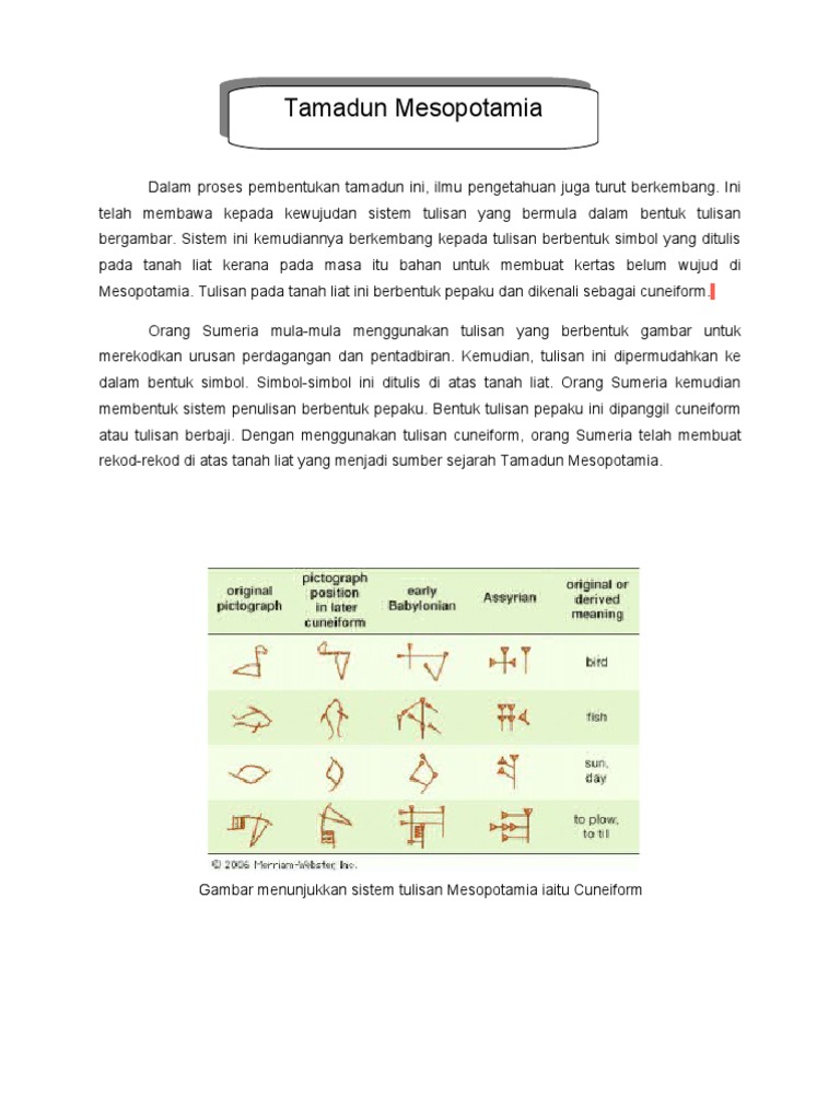 Tulisan dalam tamadun awal mempunyai pelbagai bentuk yang difahami oleh komuniti setempat contohnya di Sumeria Mesir dan China muncul tulisan piktograf yang mana gambar. Nyatakan konsep tamadun dan keutamaan Tamadun Mesopotamia ms 4-5. Juga dikenali sbg Tamadun Harappa.